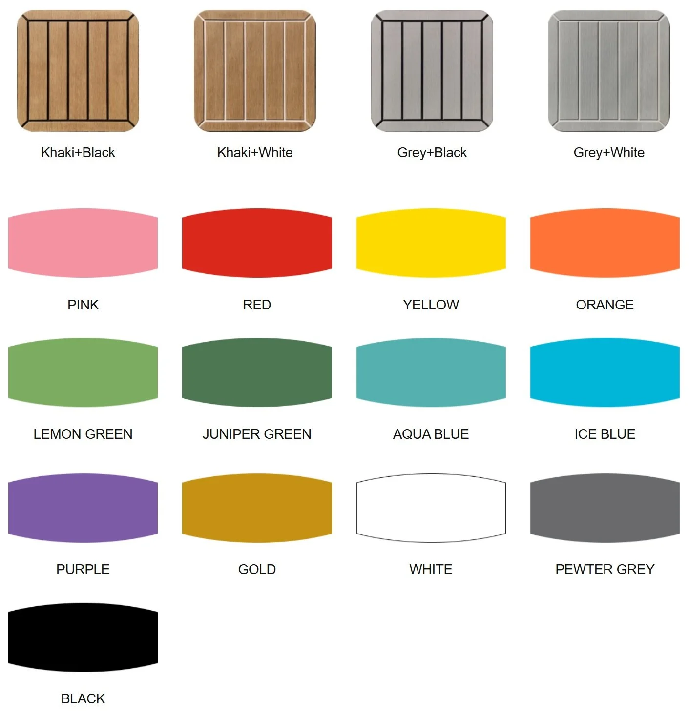Diverse color options: Create your own unique design with a choice of standard color combinations that can be endlessly varied with a logo or boat name in a different color.